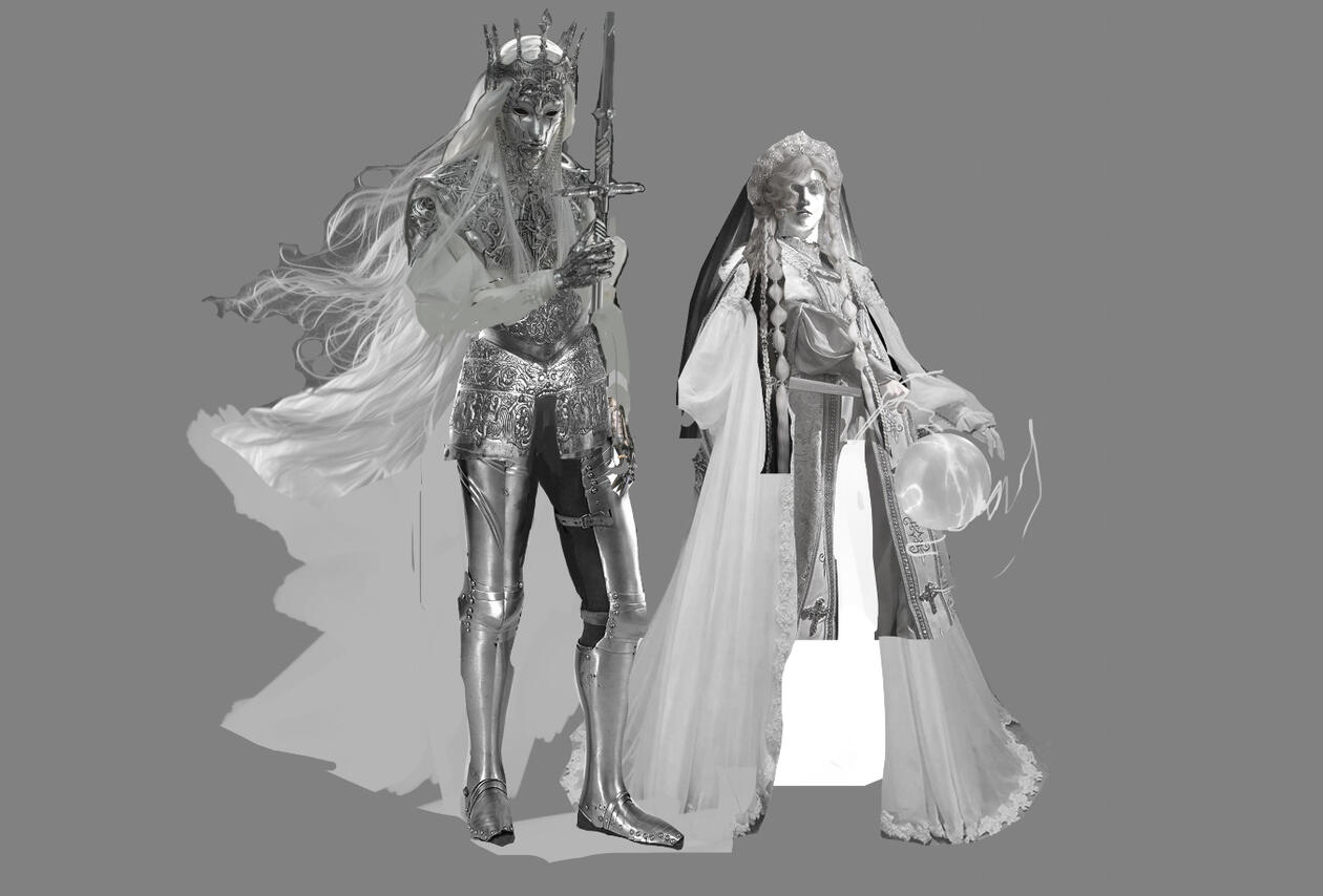How it works : You provide me with a base design of your character, along with a theme that you want to go for (e.g. sirens, autumn, life and death etc). I'll then make a single full-body character artwork with a custom design, giving me full artistic liberties for the design and style based of the theme and your provided general character traits. This will be priced based on the rendering you want as outlined above, but may be more or less depending on the complexity of the request and how much freedom I am given on the design. This is priced either at sketch or rendered price based on the previous categories, plus a 20 percent cost for design and any add-ons for extensive detail/props that can be discussed.*For commercial use of any designs, please mention this when contacting me, as they may be priced differently and I may require an agreement contract to be signed before their use.- - - - - - Example on the right is my own original design/ concept art loosely based on the Tzaritsa of Scheznaya from Genshin Impact, both designed from scratch using photobashing and rendering. The armour one is fully designed by me, while the right one has some lore but no official design yet, to give an idea of what I may do.